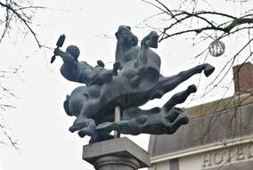 Het beeld van Fons Bemelmans uit 1947 staat op een zuil op het Onze Lieve Vrouwe plein.